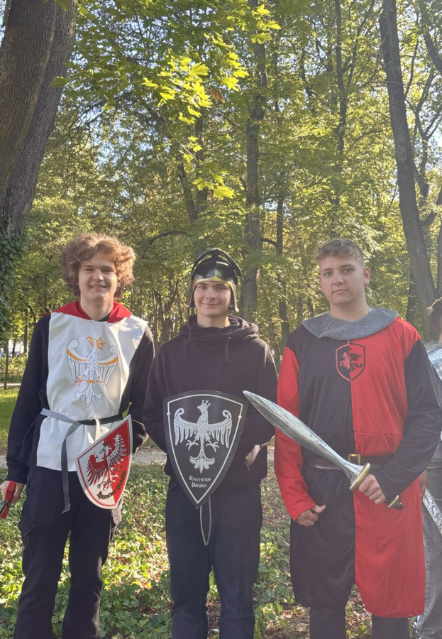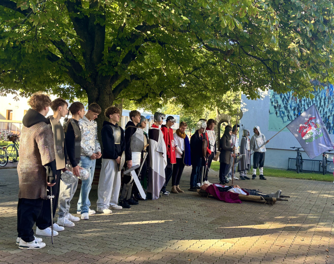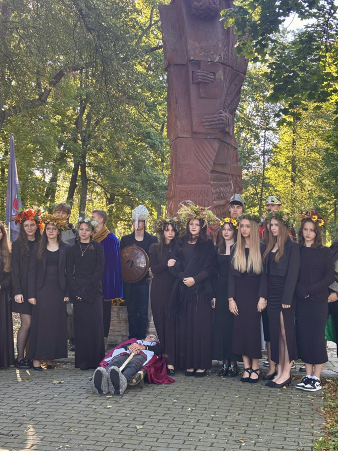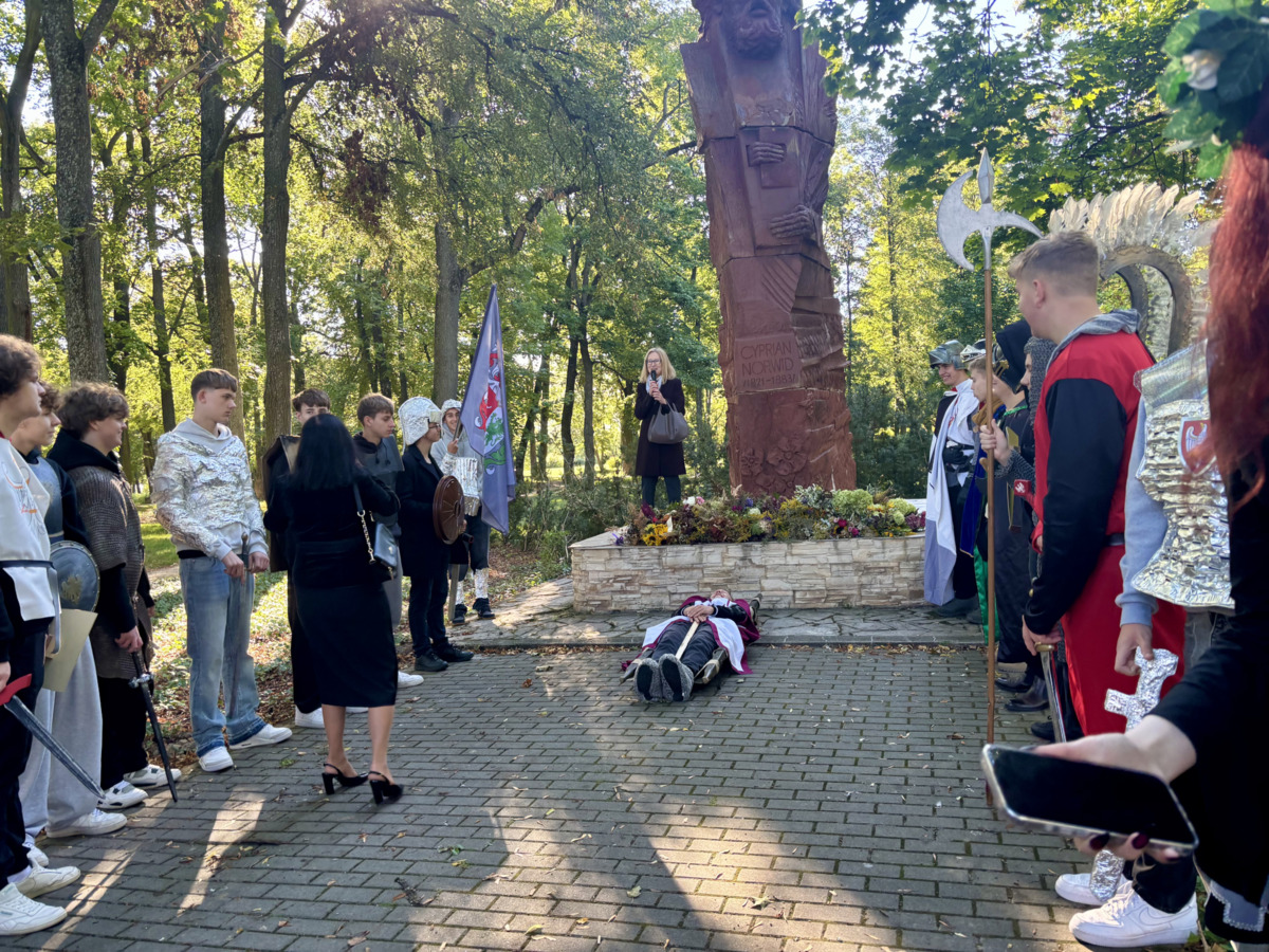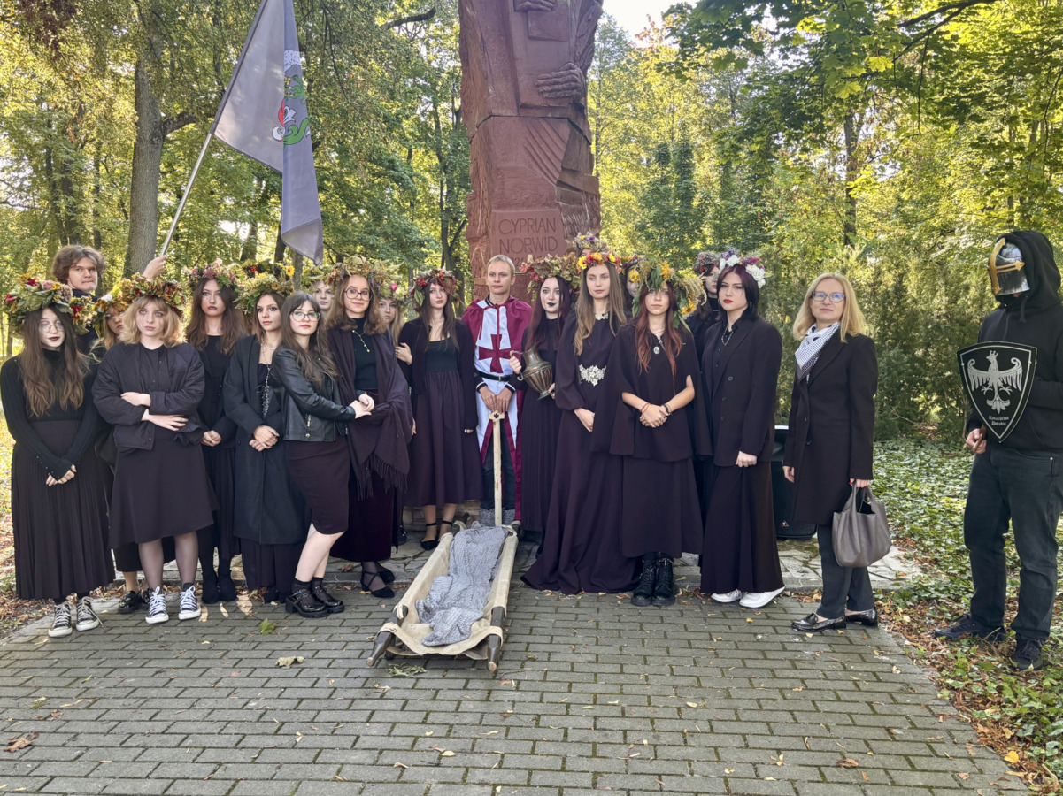 W środę 24.09.2025r., w dniu urodzin patrona naszej szkoły, po raz kolejny odbyła się plenerowa inscenizacja wiersza artysty pt.: „Bema pamięci - żałobny rapsod”. Na tegorocznej uroczystości gościliśmy uczniów z Ośrodka Szkolno-Wychowawczego i ich wychowawczynie panią Beatą Glinką oraz panią Pauliną Biernacką. Obecny był również wicedyrektor szkoły, pan Wojciech Chaciński. Uroczystość rozpoczęła się złożeniem kwiatów pod pomnikiem C. Norwida w szkolnym parku przez delegacje klas pierwszych. Białe kwiaty przewiązane błękitną wstążką mają przypominać o prawdzie, wolności i honorze. Kolejnym punktem naszej uroczystości było wysłuchanie utworu Norwida w oprawie muzycznej Czesława Niemena. Następnie drugoklasiści przebrani za płaczki oraz drużynę rycerską wyruszyli pochodem przez nasze miasto do parku. Dziewczęta opłakiwały zmarłego, a chłopcy nieśli ciało Bema, czyli Roberta Nasiadkę z klasy 2A. Nasz kolega został uroczyście położony pod pomnikiem C. Norwida w miejskim parku. Płaczki, przeszedłszy pod szpalerem z drewnianych mieczy, złożyły swoje bukiety "Bemowi" i "Norwidowi". Po zakończeniu inscenizacji nadszedł czas na pamiątkowe zdjęcia z koleżanką - płaczką w niepowtarzalnym wianku i kolegą - rycerzem, z którym wcześniej udało się stoczyć honorowy pojedynek:)