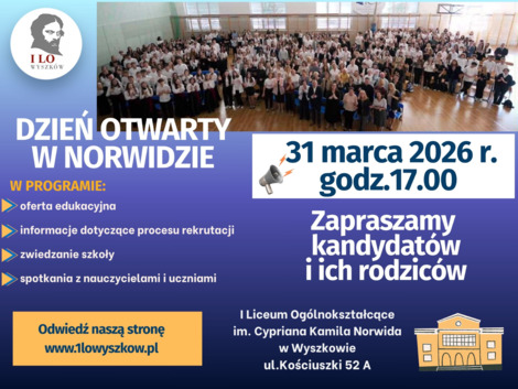 Dyrekcja, nauczyciele i cała społeczność I Liceum Ogólnokształcącego im.Cypriana Kamila Norwida serdecznie zaprasza wszystkich zainteresowanych ofertą edukacyjną naszej szkoły na spotkanie, które odbędzie się dnia 31 marca 2026 r. o godz.17.00.
