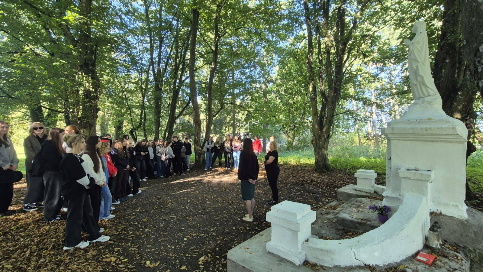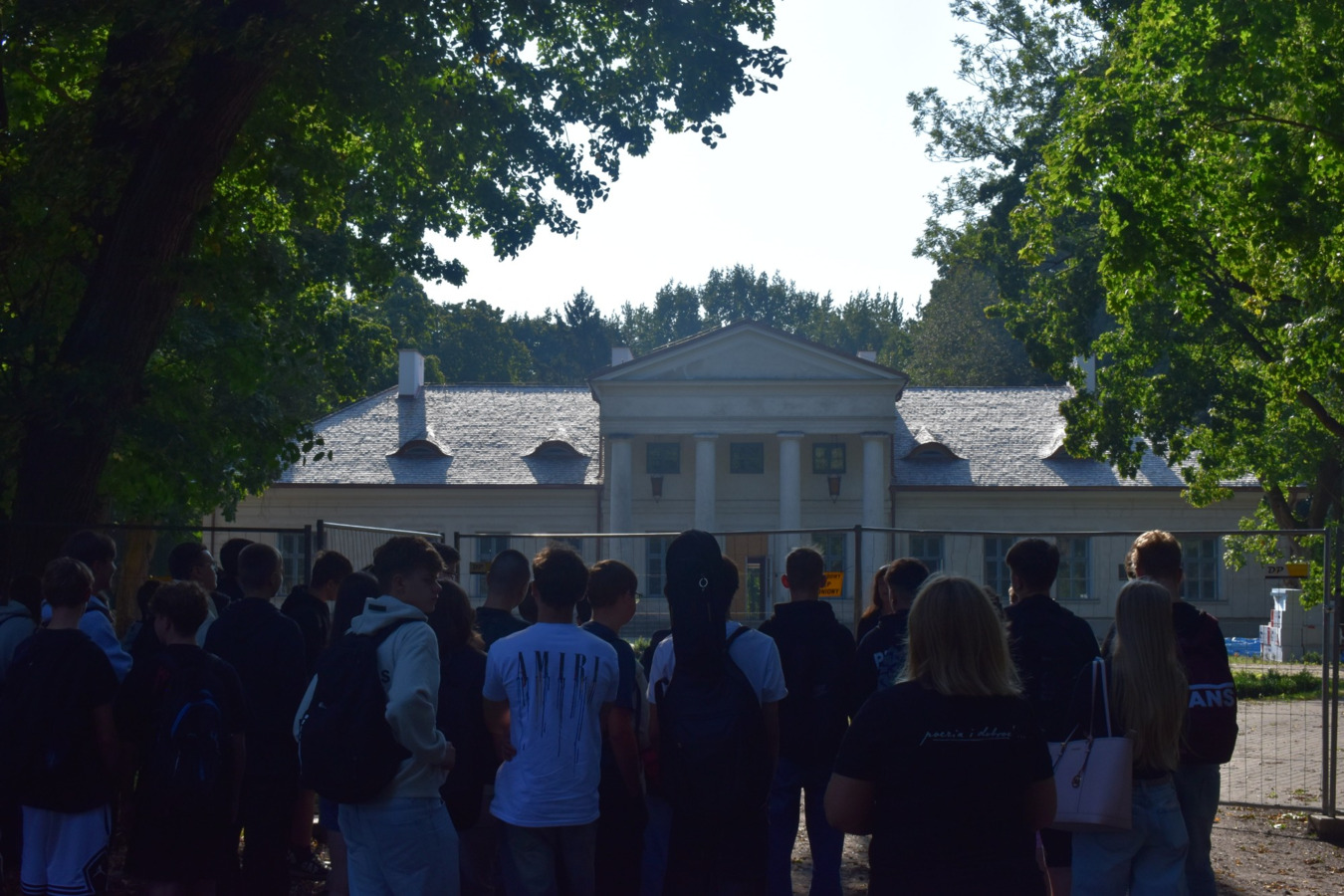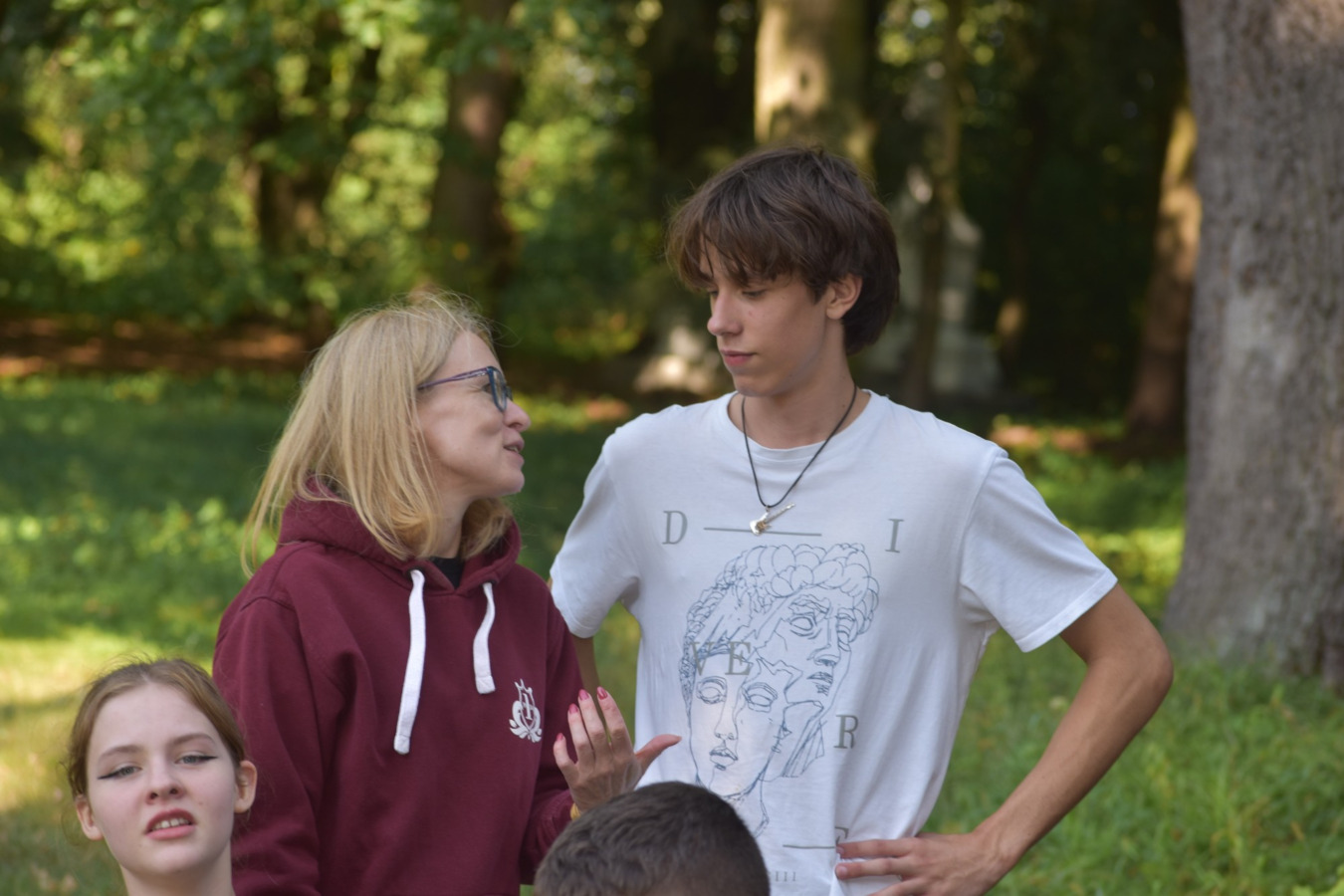 We wtorek 9 września odbyliśmy wycieczkę śladami Cypriana Norwida. Pierwszym punktem naszej wyprawy był stuletni kościół Podwyższenia Krzyża Świętego w Dąbrówce, w którym ochrzczony został nasz patron. Po krótkim zapoznaniu się z informacjami odsyłającymi do okoliczności narodzin i chrztu Cypriana Ksawerego Gerarda Walentego Norwida udaliśmy się na cmentarz na symboliczny grób jego matki, gdzie nasz kolega, Maciek Pawłowski, opowiedział nam historię związaną z miejscem pochówku. Ciekawe, że nie znane jest miejsce spoczynku zarówno Ludwiki ze Ździeborskich Norwidowej, jak i jej syna. Następnie wyruszyliśmy do Dębinek, gdzie mieści się dworek, w którym wychował się poeta, a właściwie spędzał czas wolny od nauki. Miejsce to zaledwie kilka lat temu (2021r) zostało wykupione oraz przemienione w muzeum upamiętniające Cypriana Norwida, W otaczającym dwór parku czekały na nas następujące aktywności: spotkanie z aktorem i reżyserem Grzegorzem Mrówczyńskim, zajęcia integracyjne z panią pedagog Pauliną Biernacką oraz gra terenowa, w której we współpracujących grupach musieliśmy znaleźć wszystkie fragmenty mapy ukryte za seriami zagadek. Po połączeniu wszystkich części ukazało nam się miejsce ukrytego skarbu. Po zajęciach nadszedł czas na odpoczynek przy ognisku i gitarze (dziękujemy Maksowi!), część z nas wykorzystała ten czas także na gry zespołowe, zdjęcia i rozmowyJ Wycieczka ta była świetnym pomysłem ze strony naszej wychowawczyni Pani Marzeny Delugi oraz wychowawczyni klasy 1B Pani Renaty Kacperskiej.